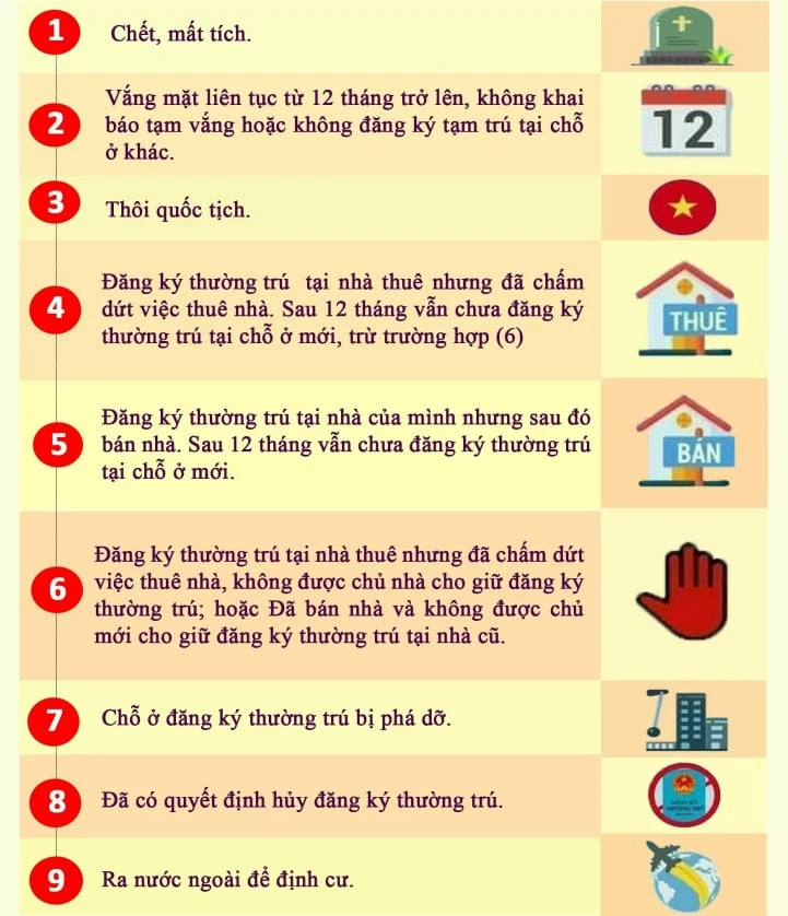 Theo Công an TP Thủ Đức, có chín trường hợp sẽ bị xoá đăng ký thường trú gồm: Người đã chết, mất tích; Vắng mặt liên tục từ 12 tháng trở lên, không khai báo tạm vắng hoặc không đăng ký tạm trú tại chỗ khác.