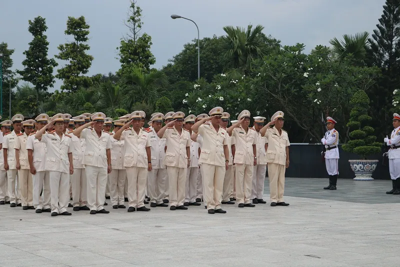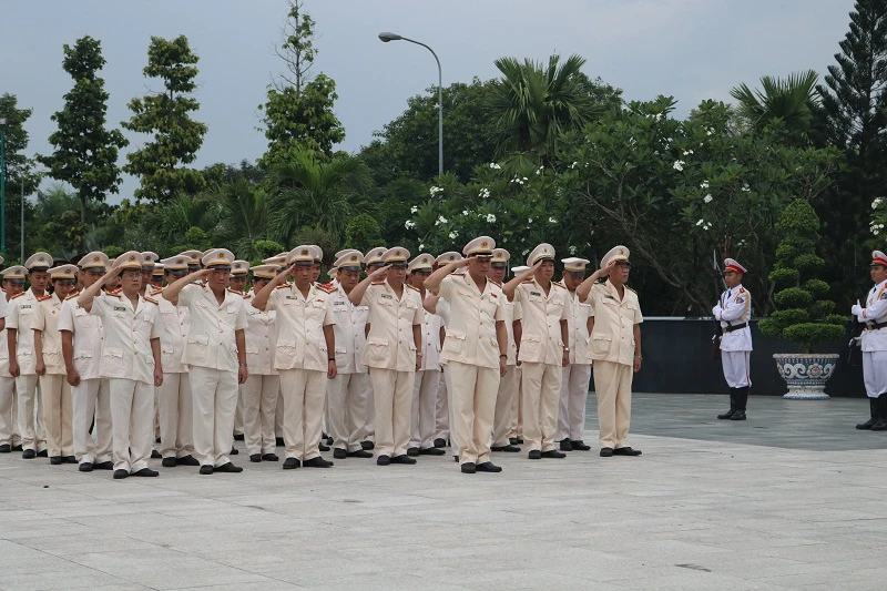 Đoàn đại biểu Công an TP.HCM do Trung tướng Lê Đông Phong, Giám đốc Công an TP.HCM, dẫn đầu dành một phút mặc niệm để tưởng nhớ các anh hùng liệt sĩ. Ảnh: THANH TUYỀN