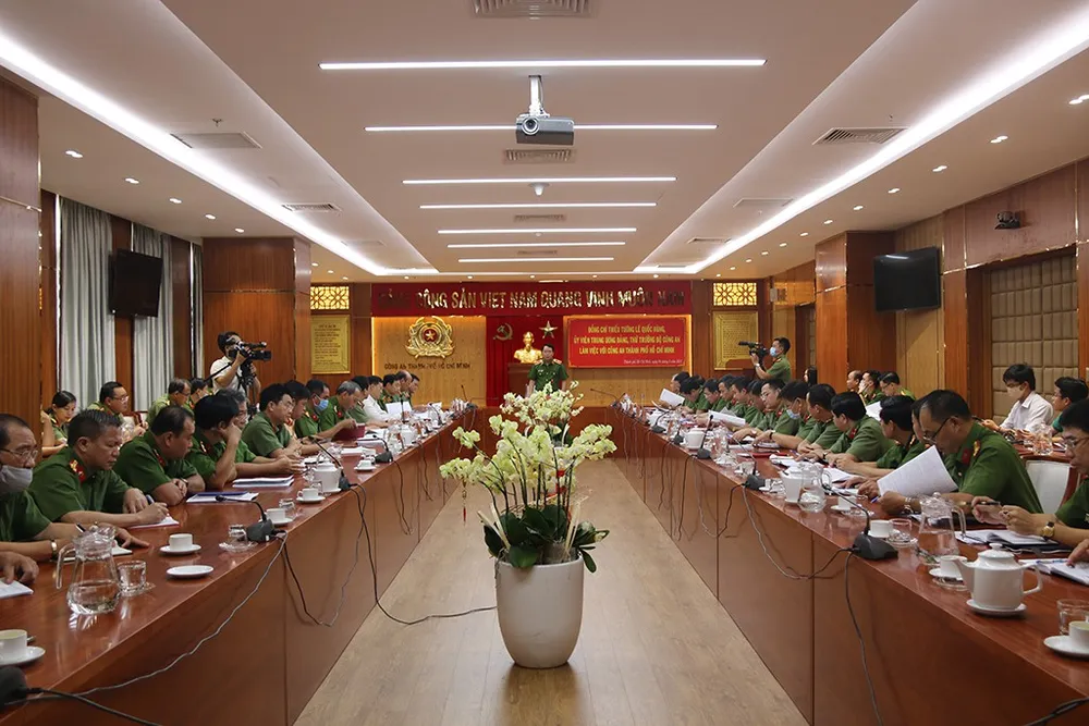 Đoàn công tác Bộ Công an làm việc với Công an TP.HCM sáng 1-4. Ảnh: CA