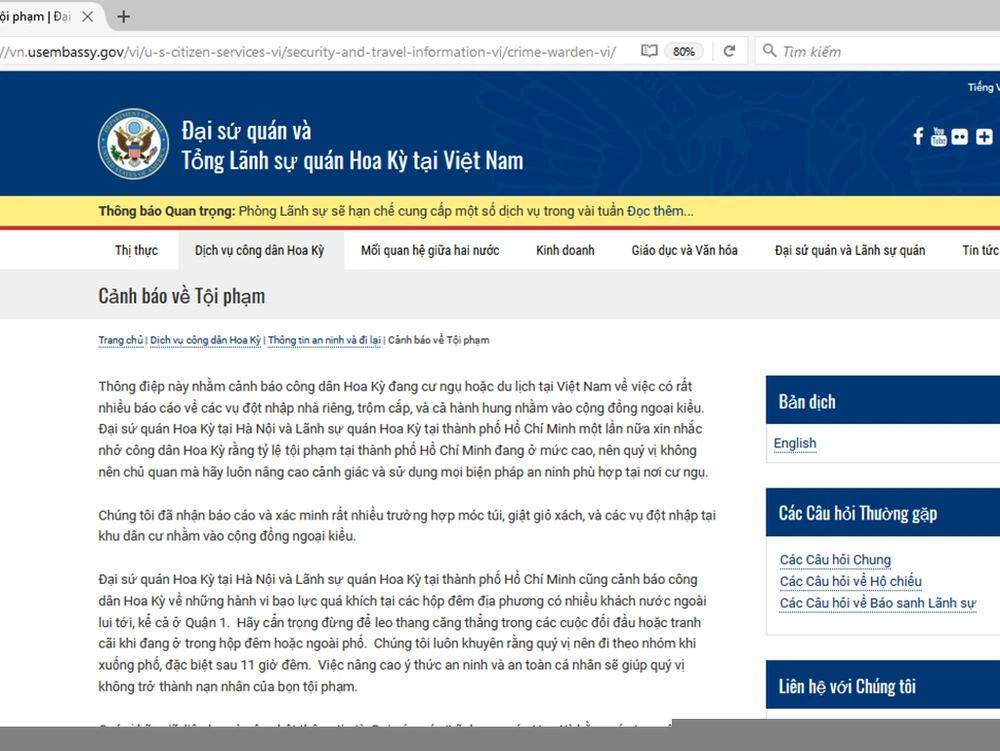 Cụ thể, thông báo viết: "Thông điệp này nhằm cảnh báo công dân Hoa Kỳ đang cư ngụ hoặc du lịch tại Việt Nam về việc có rất nhiều báo cáo về các vụ đột nhập nhà riêng, trộm cắp và cả hành hung nhằm vào cộng đồng ngoại kiều. Đại sứ quán Hoa Kỳ tại Hà Nội và Lãnh sự quán Hoa Kỳ tại TP.HCM một lần nữa xin nhắc nhở công dân Hoa Kỳ rằng tỉ lệ tội phạm tại TP.HCM đang ở mức cao, nên quý vị không nên chủ quan mà hãy luôn nâng cao cảnh giác và sử dụng mọi biện pháp an ninh phù hợp tại nơi cư ngụ...