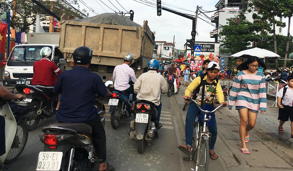 Một xe tải chở vật liệu hạng nặng chạy qua khu vực có nhiều học sinh tan trường trên đường Nguyễn Duy Trinh (Quận 9) ngày 3-1. Ảnh NT.