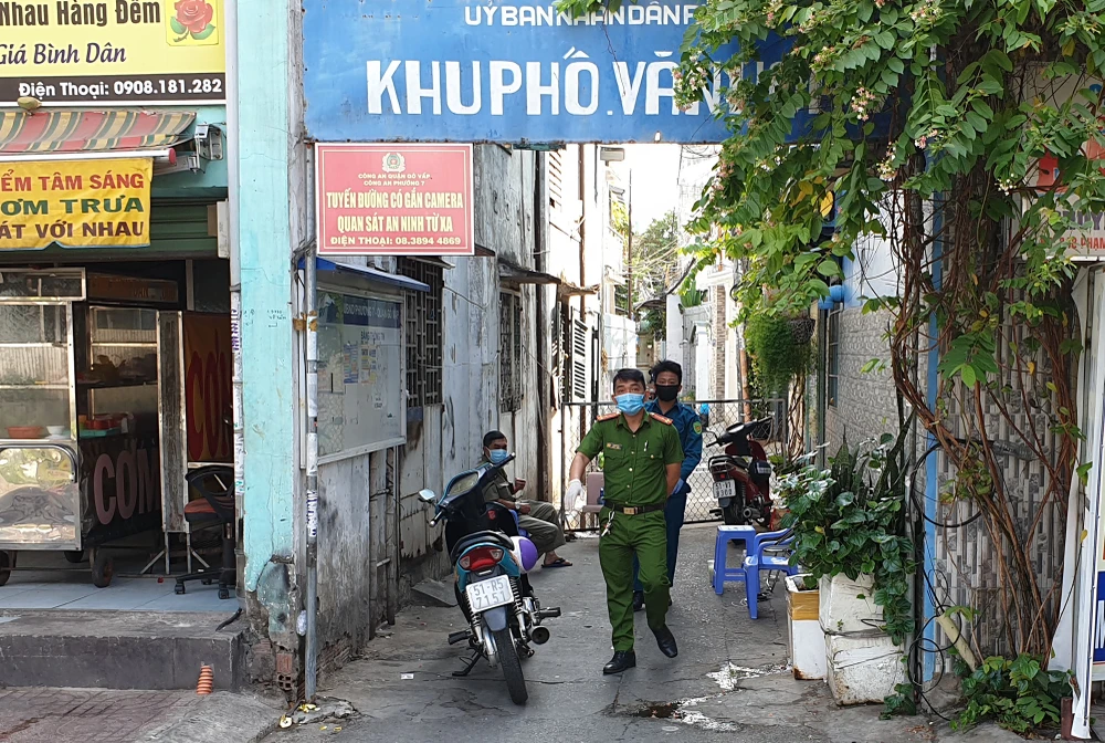 Công an phong tỏa con hẻm 248 đường Phạm Ngũ Lão (phường 7, quận Gò Vấp) sau khi phát hiện một ca dương tính ở đây. Ảnh: NT