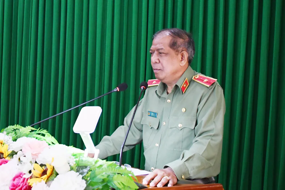 Thiếu tướng Kiên Rịnh, tân Phó Giám đốc Công an tỉnh Trà Vinh phát biểu nhận nhiệm vụ. Ảnh: CA