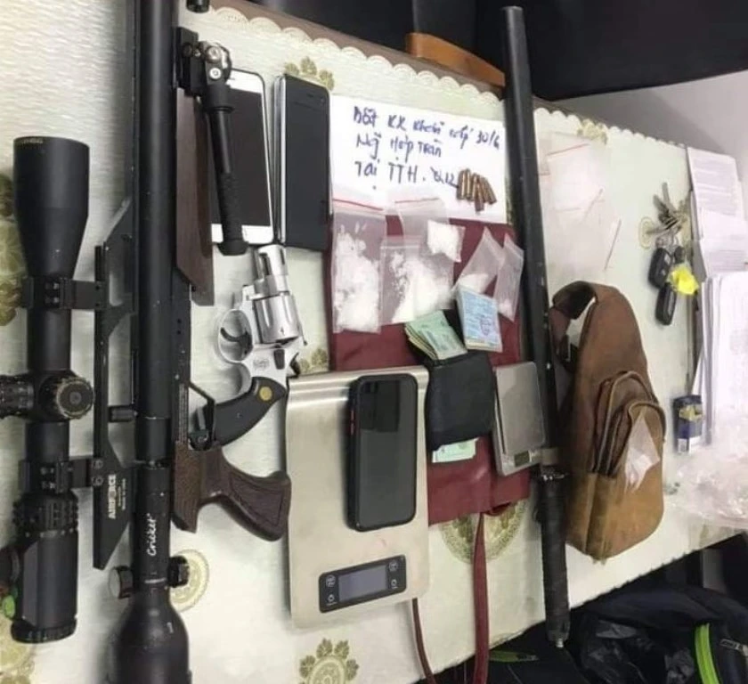 Tang vật thu được khi khám xét nơi ở của năm nghi can gồm ma túy, súng và đạn... Ảnh: CACC