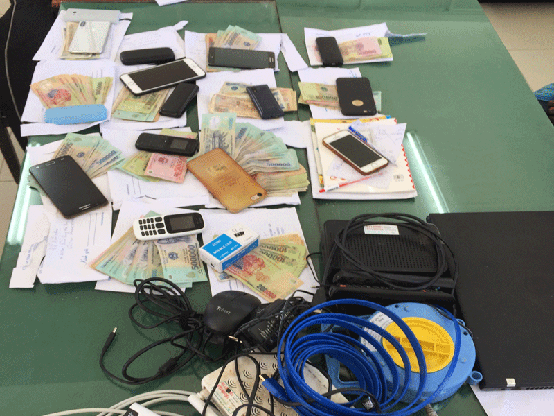 Tại hiện trường, lực lượng chức năng đã thu giữ được tang vật gồm 109 triệu đồng tiền mặt, 15 chiếc điện thoại các loại, hai đầu thu Viettel, một laptop và một tivi.