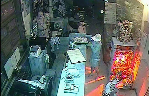 Camera của tiệm vàng ghi lại hình ảnh kẻ trộm lọt vào trong lấy vàng tại tủ trưng bày. Ảnh: CTV
