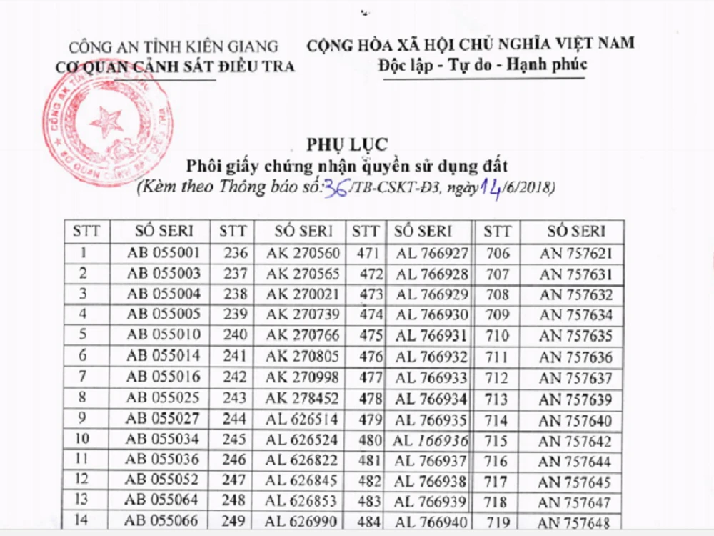 Quá trình điều tra xác định một số tài liệu có liên quan vụ án đã bị mất từ năm 2014 đến nay. Tài liệu này bao gồm hơn 1.000 phôi giấy chứng nhận quyền sử dụng đất. Công an cũng gửi kèm phụ lục số sêri phôi để các ngân hàng trên địa bàn tỉnh kiểm tra rà soát.