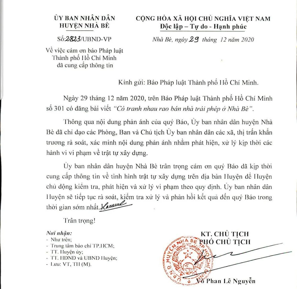 Trong ngày 29-12, ông Võ Phan Lê Nguyễn, Phó Chủ tịch UBND huyện Nhà Bè, đã có văn bản cảm ơn báo Pháp luật TP.HCM về việc đã cung cấp thông tin về tình trạng vi phạm trật tự xây dựng trên địa bàn huyện.