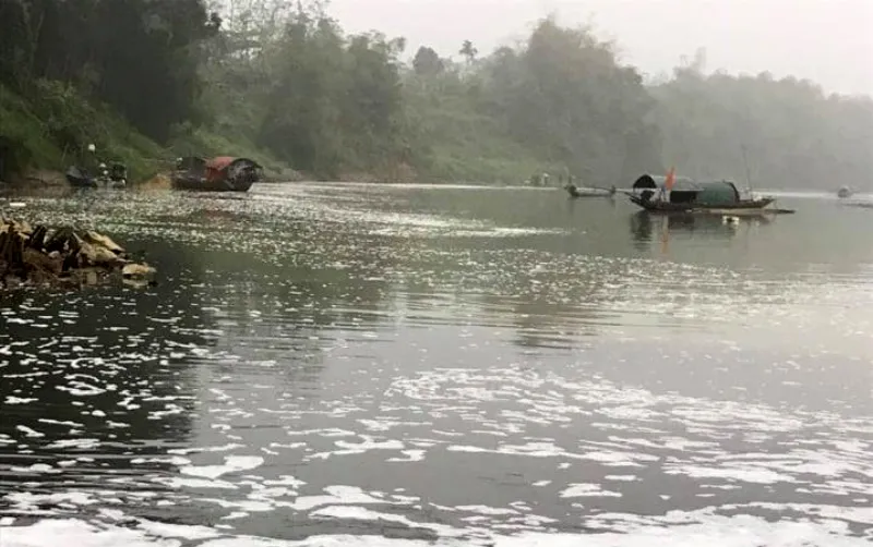 Bọt trắng nổi lên, dòng sông Chu đen kịt đúng vào thời điểm cá lồng chết nổi trắng ở nhiều xã Thọ Hải, Xuân Thiên.