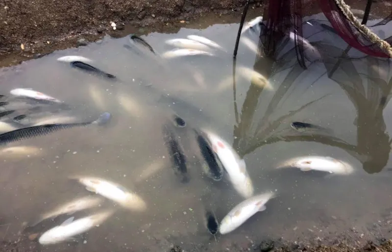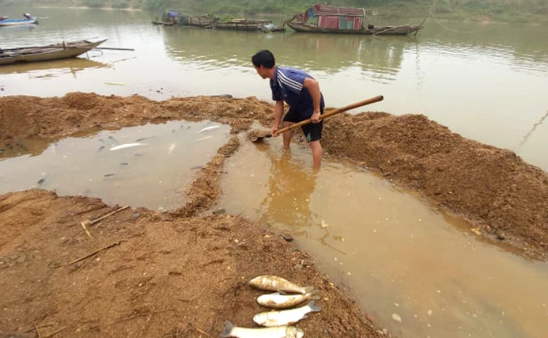 Một người dân thấy cá chết bất thường đã ngăn cát lọc nước, đưa cá vào bên trong rãnh nước vừa làm xong với hy vọng "còn nước còn tát" nhưng cá vẫn chết.