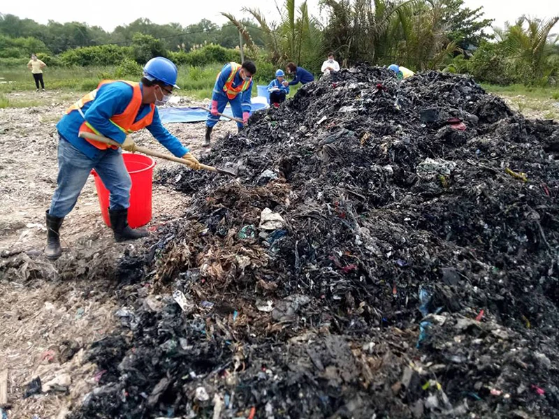 Cơ quan chức năng tiến hành lấy mẫu rác thải để kiểm tra mức độ nguy hại. Ảnh: KIÊN CƯỜNG
