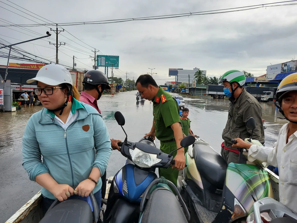 Lực lượng Đoàn thanh niên Công an thị xã Bình Minh, tỉnh Vĩnh Long phối hợp với đội CSGT dùng xe tải chuyên dụng hỗ trợ người dân qua đoạn ngập.