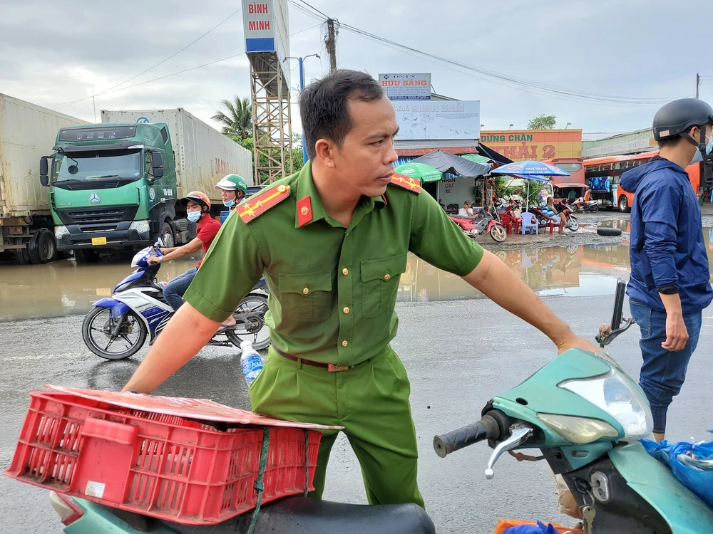Trước tình hình này, Đoàn thanh niên Công an thị xã Bình Minh phối hợp với đội CSGT và xã đoàn Thuận An đã có mặt để điều tiết giao thông, hướng dẫn người dân đi đường tắt để tránh ngập.