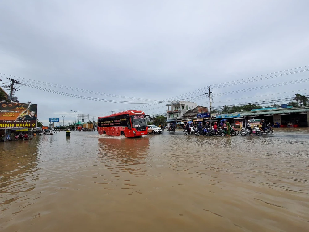 Sáng 19-10, triều cường lên cao gây ngập sâu tuyến quốc lộ 1, có nơi ngập đến 1m, gây khó khăn cho phương tiện lưu thông.