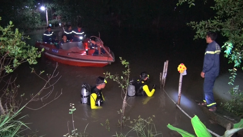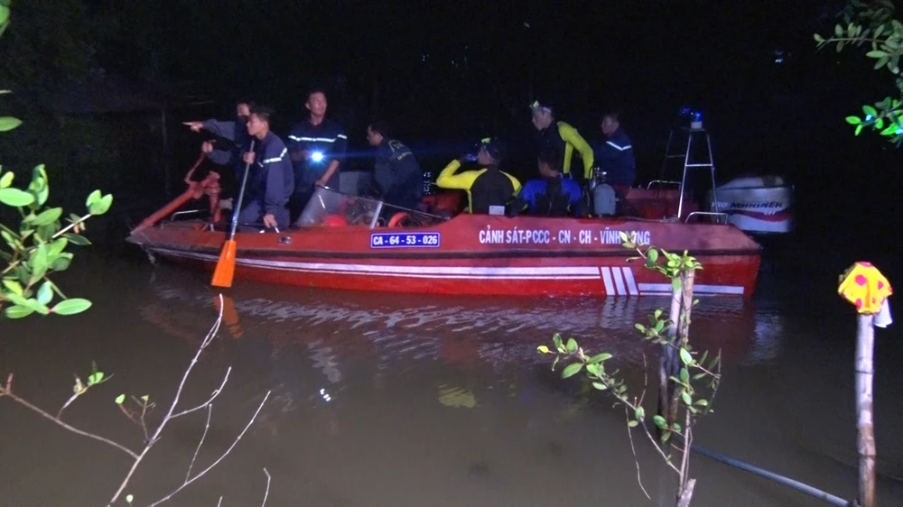 Lực lượng phòng cháy chữa cháy và cứu hộ Công an tỉnh Vĩnh Long cho đội lặn tìm kiếm khẩn trương. Ảnh: T.NGHĨA