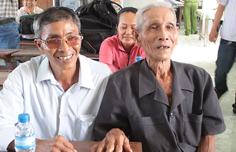 Ông Phan Văn Lá (trái) cùng cha tại buổi xin lỗi công khai. Ảnh: NGÂN NGA