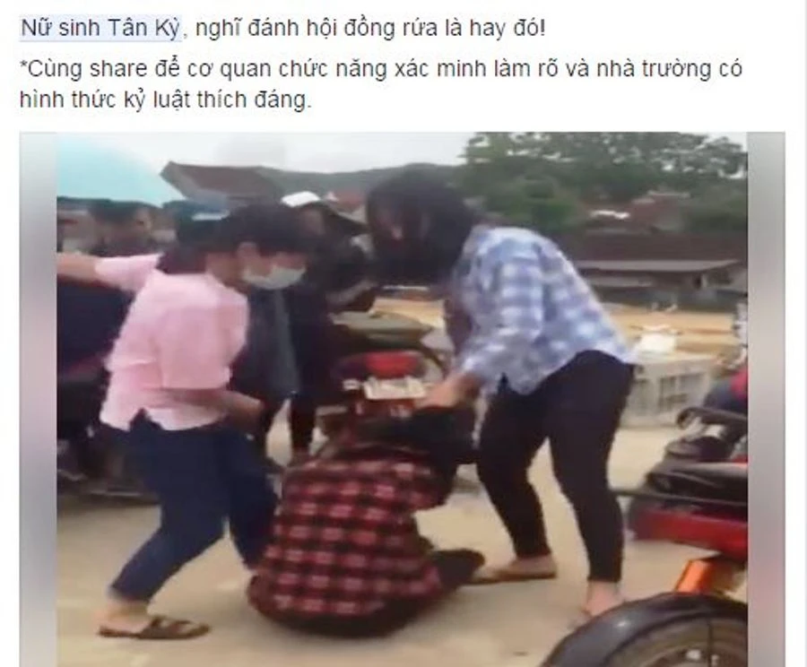 Clip chia sẻ trên mạng xã hội với chú thích: Nữ sinh Tân Kỳ, nghĩ đánh hội đồng rứa là hay đó".