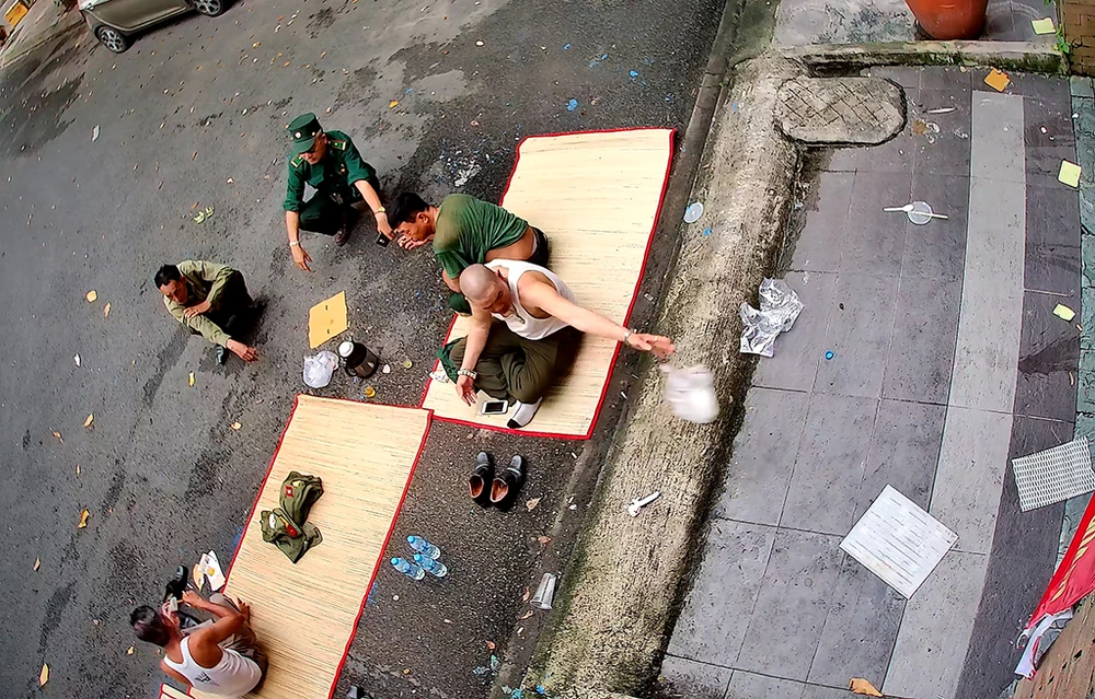 Những người này trải chiếu trước công ty, ăn uống và xả rác. (Ảnh cắt từ clip)