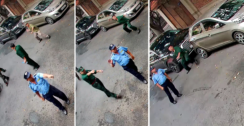 Những người xưng là cựu chiến binh ném đá vào trụ sở công ty trên đường Phổ Quang. (Ảnh cắt từ clip)