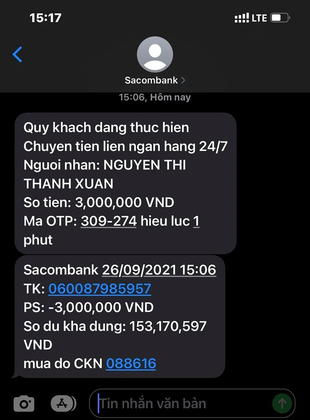 Qua tin nhắn anh C. cung cấp thì số tài khoản được chuyển đến là của một người phụ nữ tên là “Nguyen Thi Thanh Xuan” nội dung chuyển khoản là “mua do” vào 15 giờ 06 phút ngày 26-9.