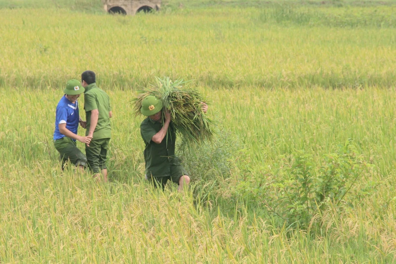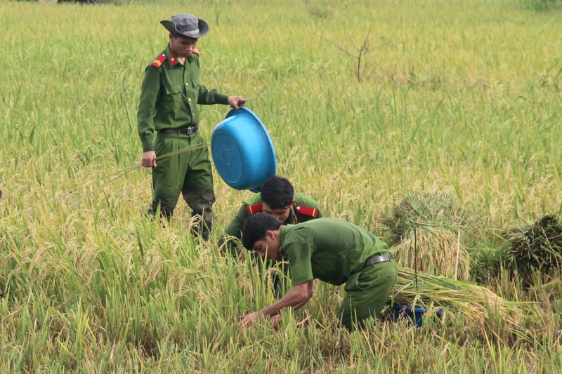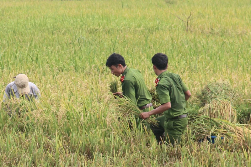 Các chiến sỹ công an tỉnh Quảng Trị xuống đồng gặt lúa cho dân.
