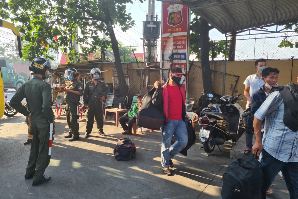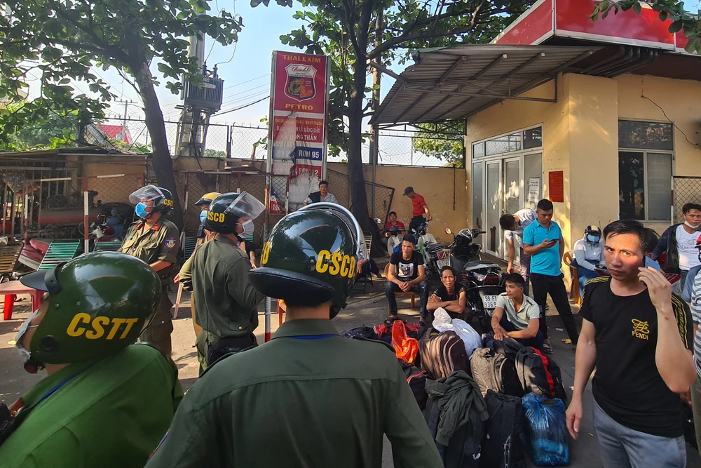 Lực lượng công an giải tán nhóm người chờ đón xe ở cây xăng. Ảnh: LÊ ÁNH