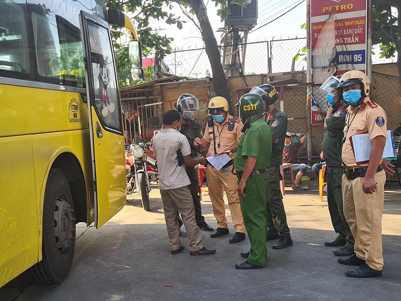 Trong chiều cùng ngày, CSGT và trật tự Công an TP Dĩ An đã xử lý nhiều trường hợp xe khách đón trả khách tại cây xăng ga Sóng Thần.