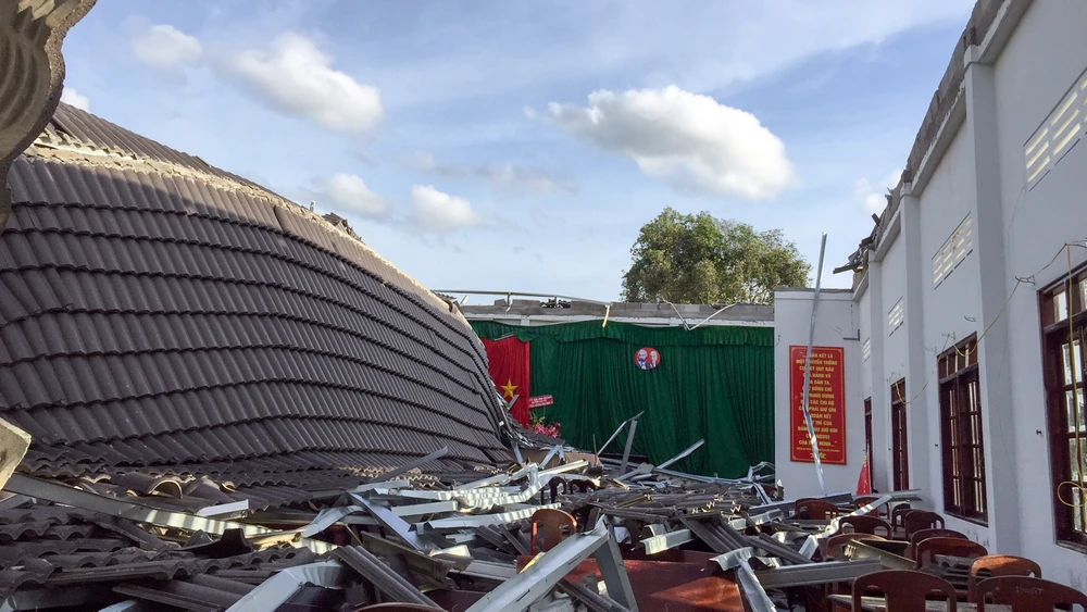Hiện trường sự cố sập mái hội trường 250 chỗ thuộc khu hành chính UBND thị trấn Ngã Sáu (huyện Châu Thành, tỉnh Hậu Giang). Ảnh: CHÂU ANH