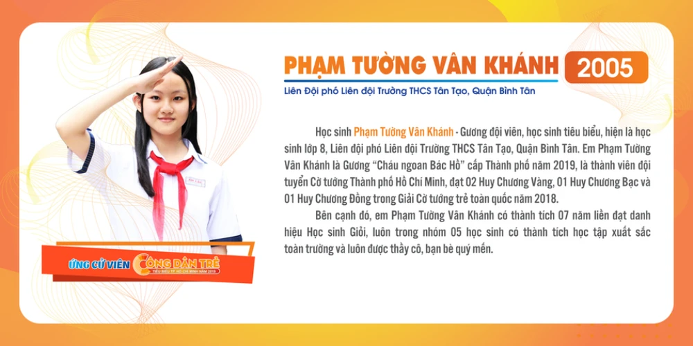4. Nữ sinh Phạm Tường Vân Khánh (14 tuổi), liên đội phó Trường THCS An Lạc (quận Bình Tân), bảy năm liền là học sinh giỏi. Em luôn nằm trong tốp 5 học sinh có kết quả học tập xuất sắc toàn trường, là thành viên đội tuyển cờ tướng của TP.HCM với nhiều huy chương tại các giải thi đấu trẻ toàn quốc. Em luôn được thầy cô, bạn bè quý mến.