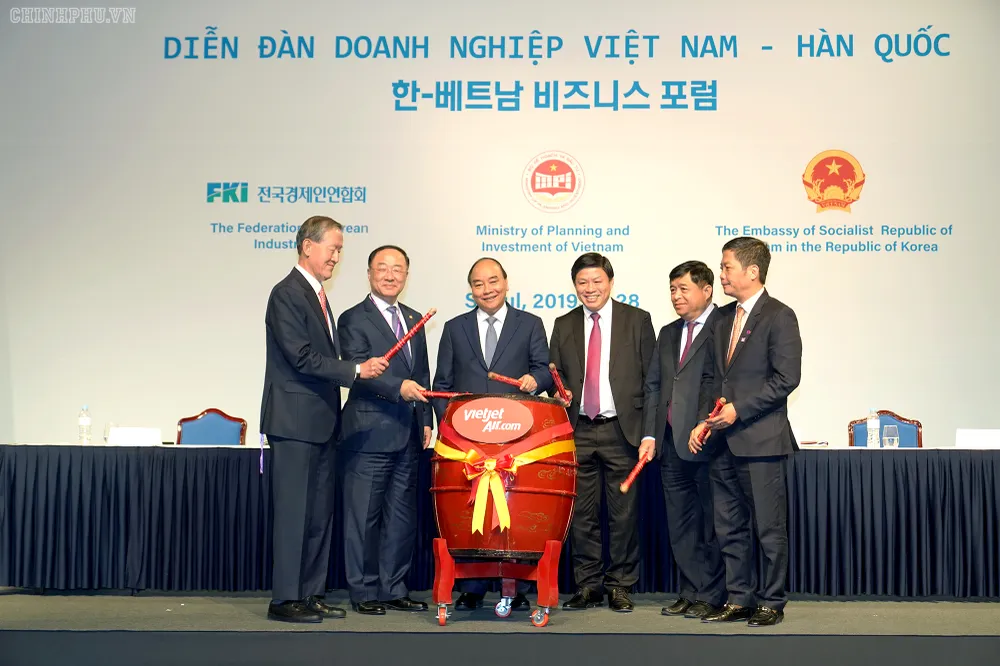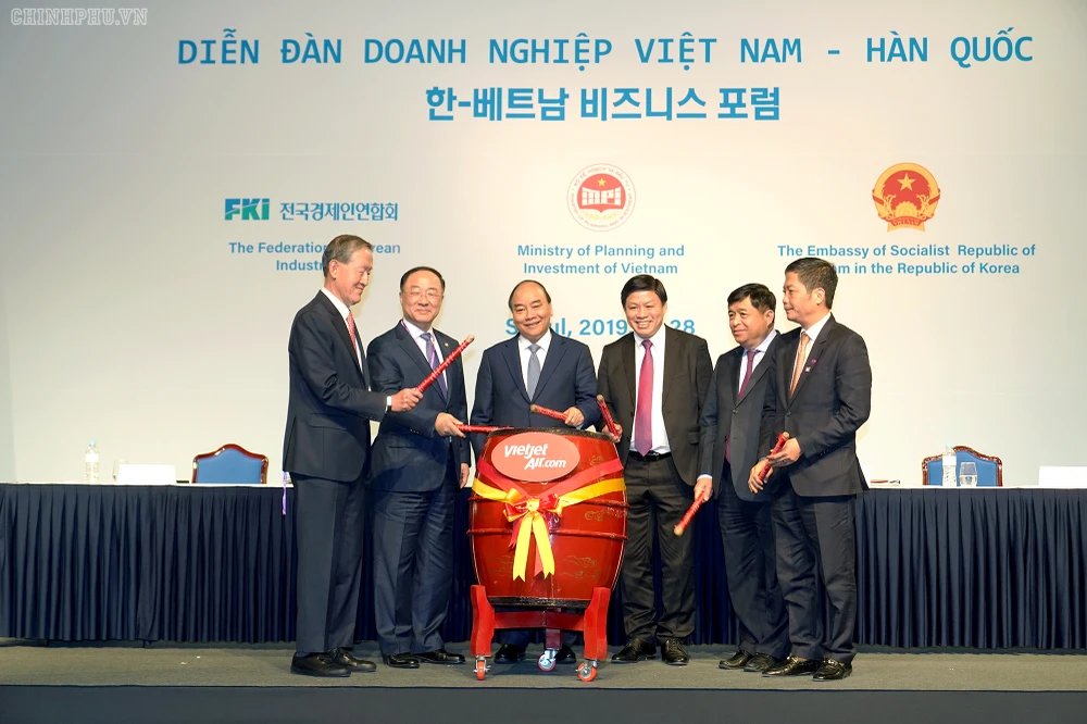 Thủ tướng cùng các thành viên Chính phủ tại Diễn đàn Xúc tiến đầu tư kinh doanh Việt Nam - Hàn Quốc. Ảnh: VGP