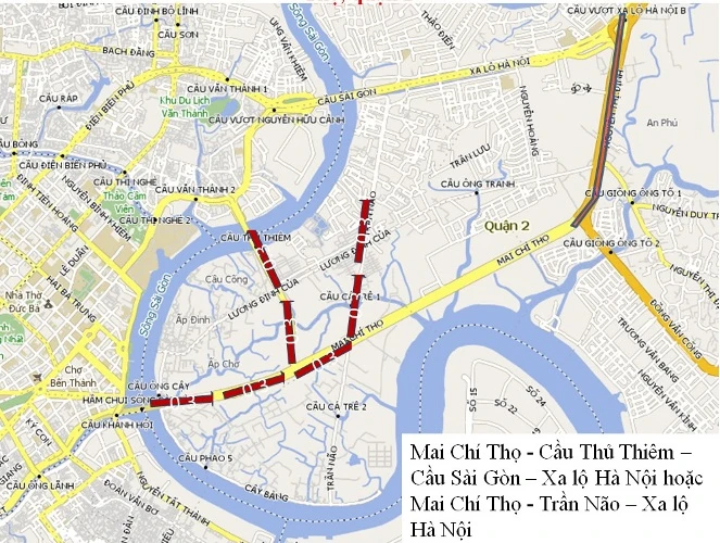 Kể từ nay đến khi sửa chữa xong khuyết tật trên đường Mai Chí Thọ (dự kiến đến cuối năm 2014), Sở GTVT khuyến nghị dòng xe qua hầm sông Sài Gòn ra xa lộ Hà Nội nên “né” khu vực công trình bằng lộ trình: Mai Chí Thọ → cầu Thủ Thiêm → cầu Sài Gòn → xa lộ Hà Nội hoặc Mai Chí Thọ → Trần Não → xa lộ Hà Nội. Ảnh: MP