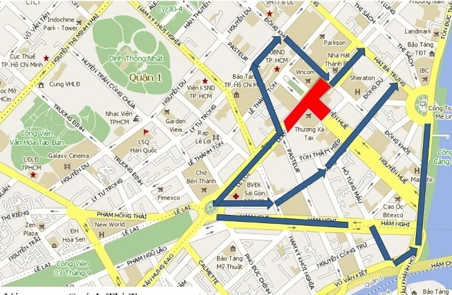 - Theo hướng từ Tây sang Đông theo mũi tên màu xanh của sơ đồ ảnh 7 để tránh khu vực thi công (khu vực màu đỏ). Ảnh: MP