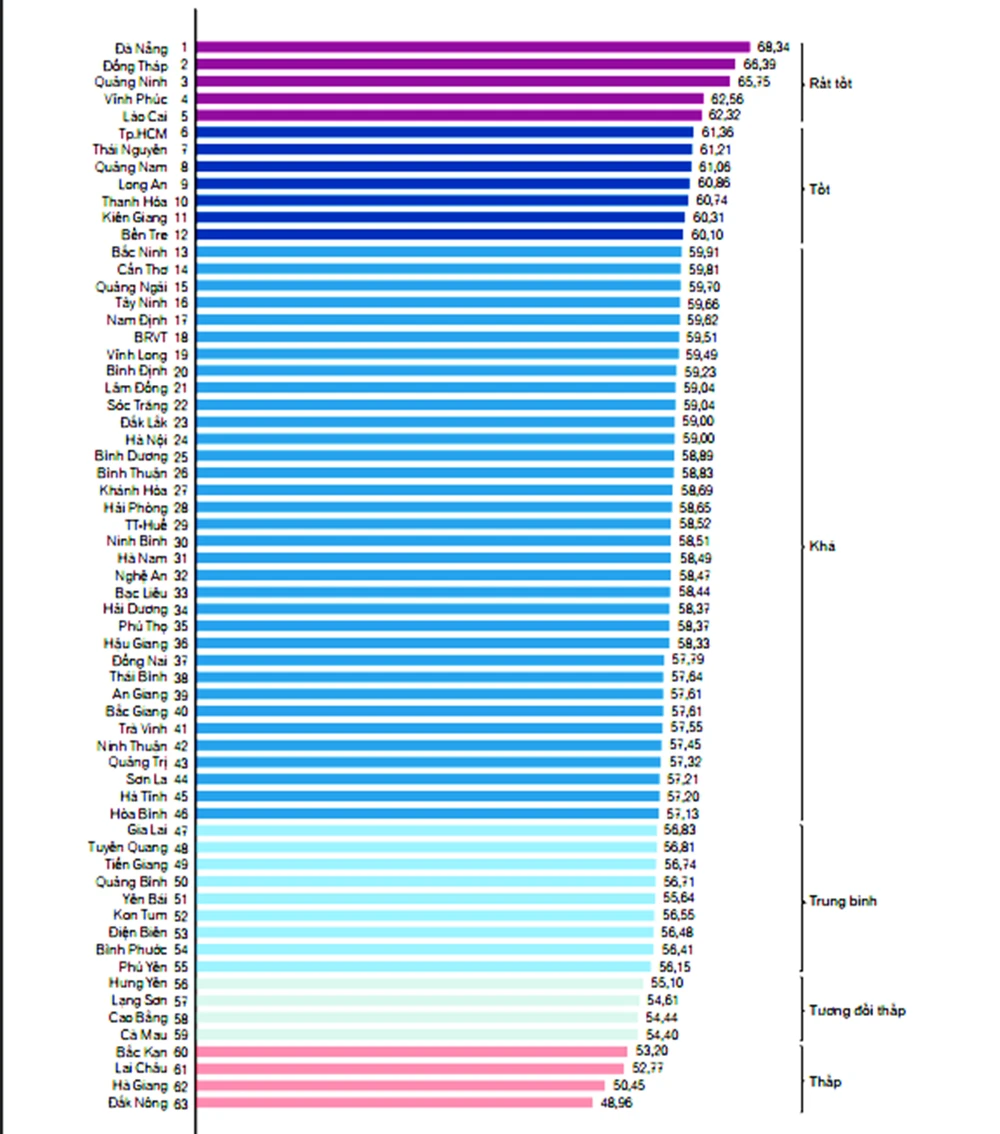 Các tỉnh xuất sắc khác sau Đà Nẵng là Đồng Tháp (66,39 điểm) và Quảng Ninh (65,75 điểm), những tỉnh đứng đầu của bảng xếp hạng với nhiều sáng kiến cải cách trong cải cách hành chính như tinh gọn bộ máy, công khai, minh bạch trong đánh giá và lựa chọn cán bộ.