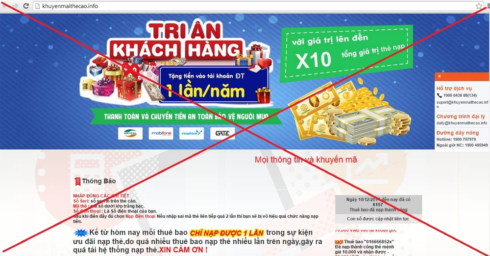 Qua xác minh, cơ quan chức năng đã phát hiện một số đối tượng tạo lập các website mạo danh cá nhân, đại diện đơn vị cung cấp dịch vụ trên mạng xã hội Facebook, Zalo với nội dung thông báo chương trình trúng thưởng nhằm chiếm đoạt tài sản của người dùng.