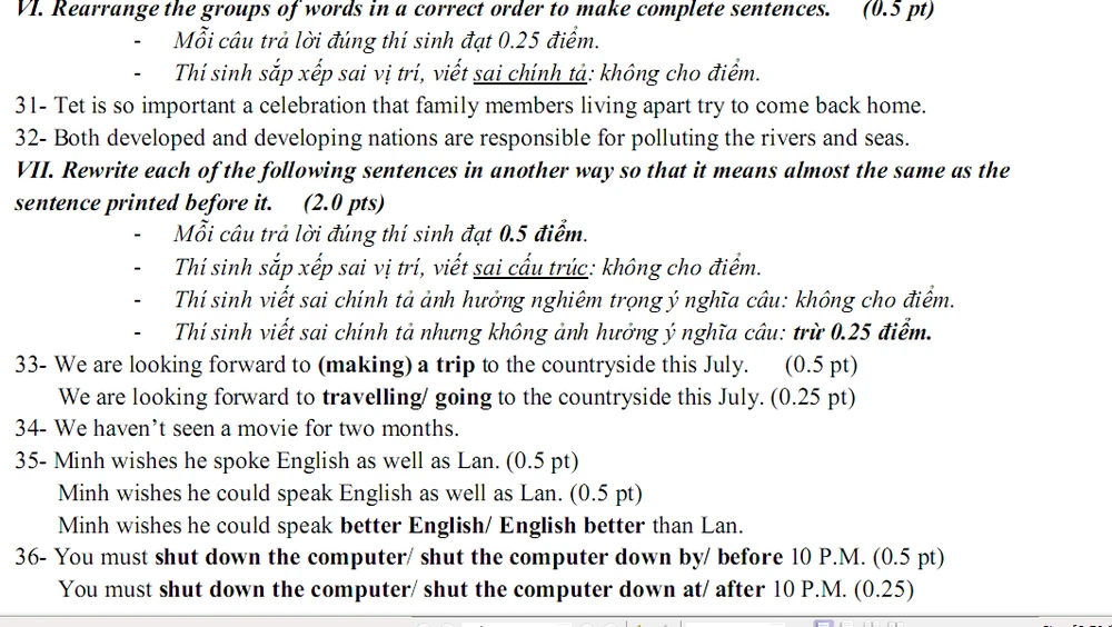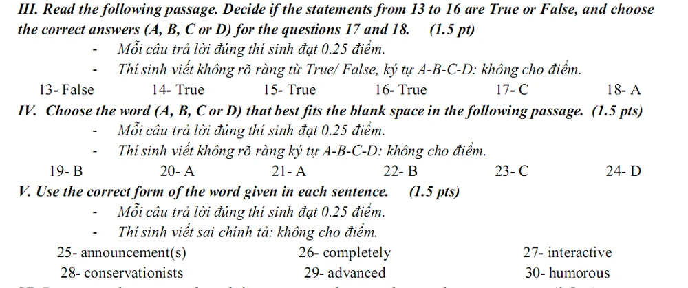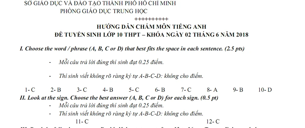Sau đây là đáp án môn tiếng Anh: