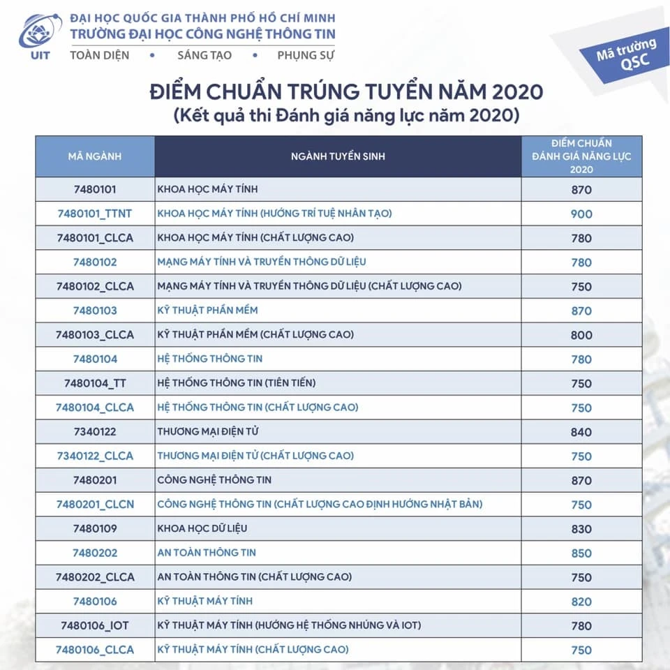Trường ĐH Công nghệ Thông tin (ĐH Quốc gia TP.HCM) vừa thông báo điểm chuẩn trúng tuyển diện xét tuyển dựa vào kết quả kỳ thi đánh giá năng lực do ĐH Quốc gia TP.HCM tổ chức năm 2020.