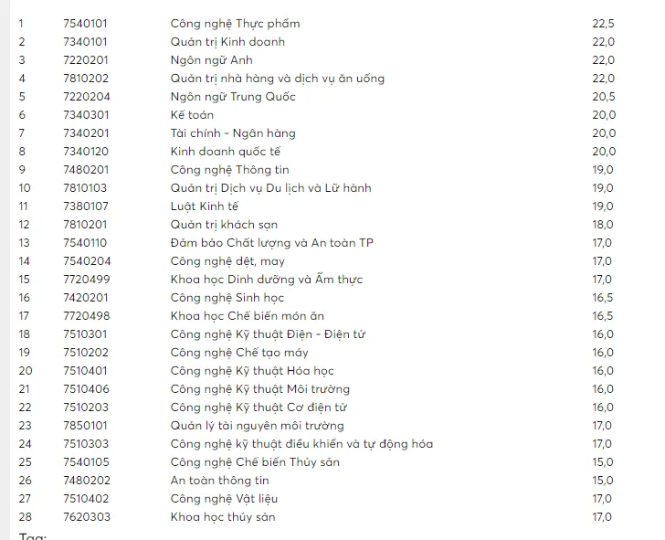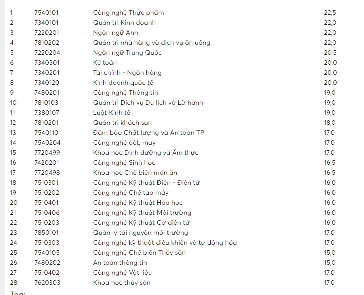 Trong đó, Công nghệ thực phẩm là ngành có điểm chuẩn cao nhất với 22,5 điểm. Kế đến là hai ngành Ngôn ngữ Anh và Quản trị nhà hàng và dịch vụ ăn uống với 22 điểm.