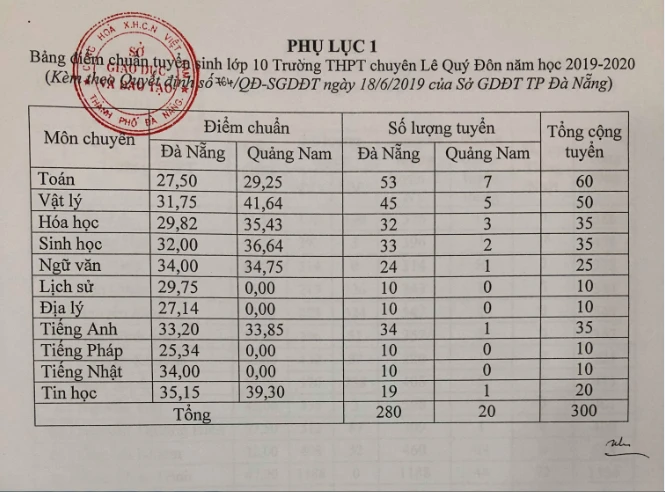 Đối với trường THPT chuyên Lê Quý Đôn, điểm chuẩn từng môn đối với học sinh Đà Nẵng và Quảng Nam cũng giảm khá mạnh so với năm ngoái. Năm học 2019-2020, tổng chỉ tiêu tuyển sinh của trường là 300 học sinh, trong đó học sinh Đà Nẵng là 280 em, còn lại là học sinh Quảng Nam.