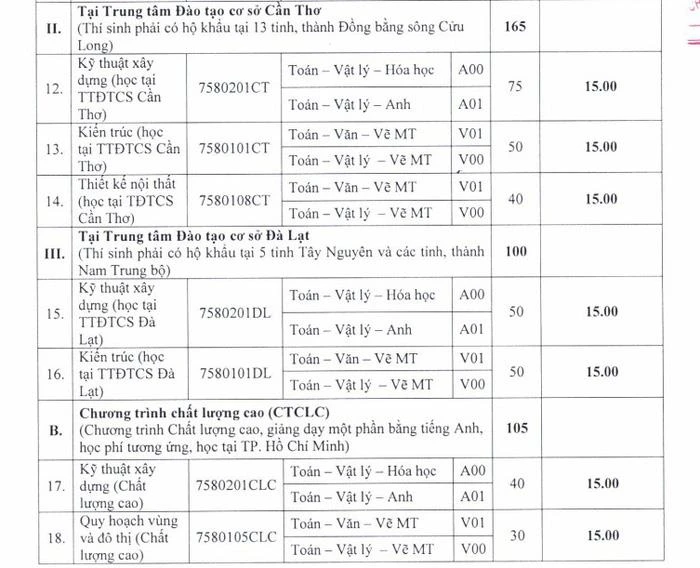 Trong đó, cơ sở đào tạo chính của trường tại TP.HCM, điểm sàn cao nhất là hai ngành Kiến trúc và Thiết kế nội thất cùng 18 điểm.