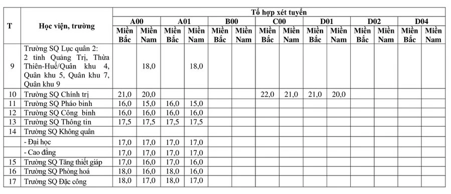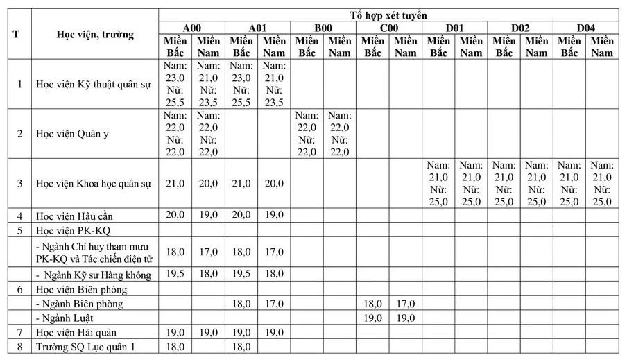 Theo đó, điểm sàn nhận hồ sơ vào các trường quân đội dao động từ 16 đến 25,5 điểm. Các mức điểm sàn được chia theo khu vực và giới tính, tổ hợp môn.