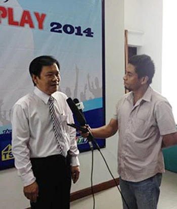 Ông Mai Ngọc Phước, phó tổng biên tập phụ trách báo Pháp Luật TP. HCM, trưởng BTC giải Fair Play 2014 đang trả lời phỏng vấn phóng viên truyền hình. ẢNH: PHẠM QUANG