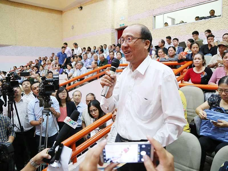 Cử tri quận 2 phát biểu các vấn đề về khu đô thị mới Thủ Thiêm trong một lần tiếp xúc với ĐBQH. Ảnh: HOÀNG GIANG