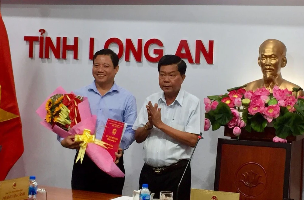 Chủ tịch UBND tỉnh Long An Trần Văn Cần trao quyết định và chúc mừng ông Phạm Tấn Hòa.