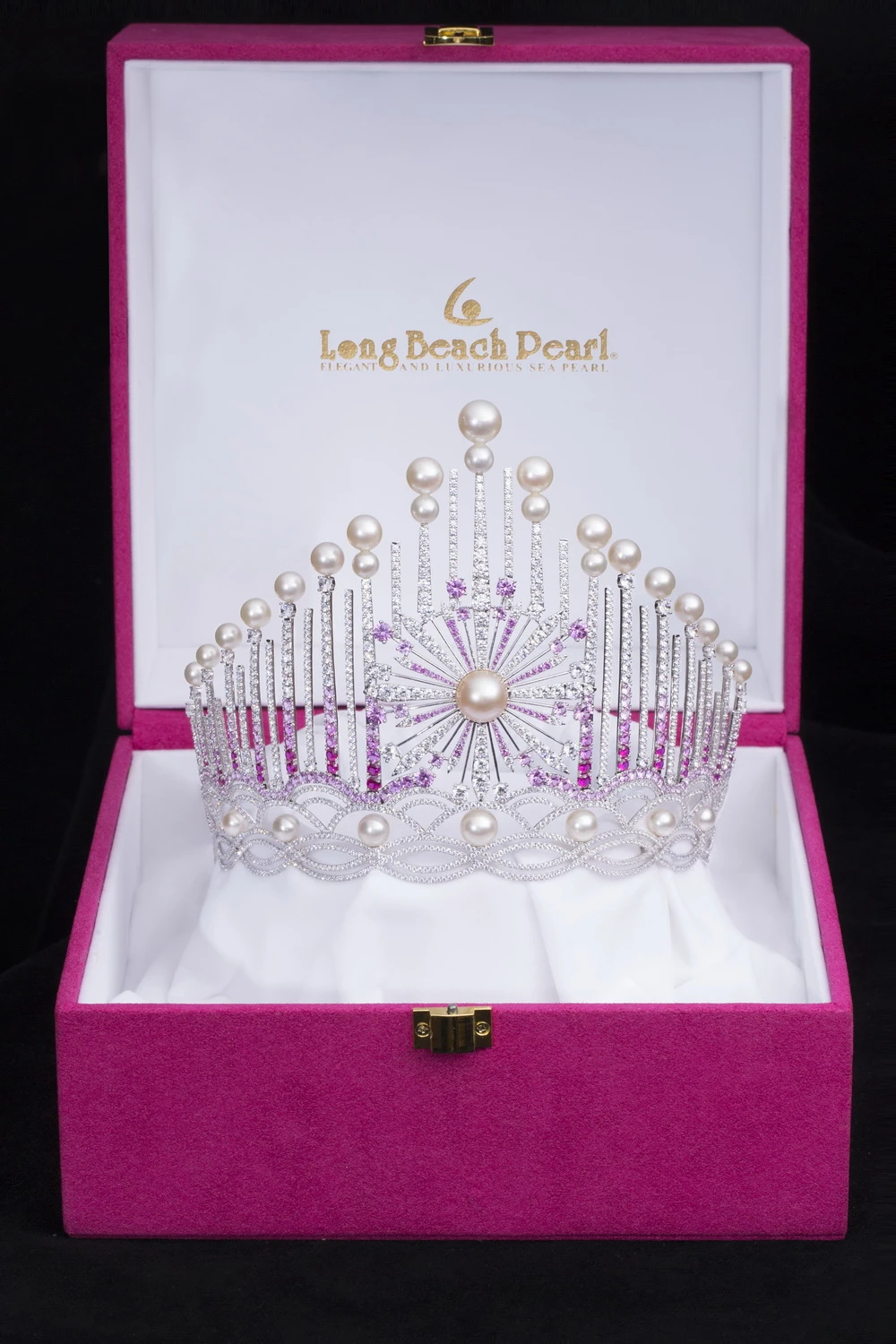 Theo đó, vương miện do Long Beach Pearl thực hiện, làm bằng 30 viên ngọc trai lớn, 3.260 viên đá sapphire cẩn trên khung vàng trắng.