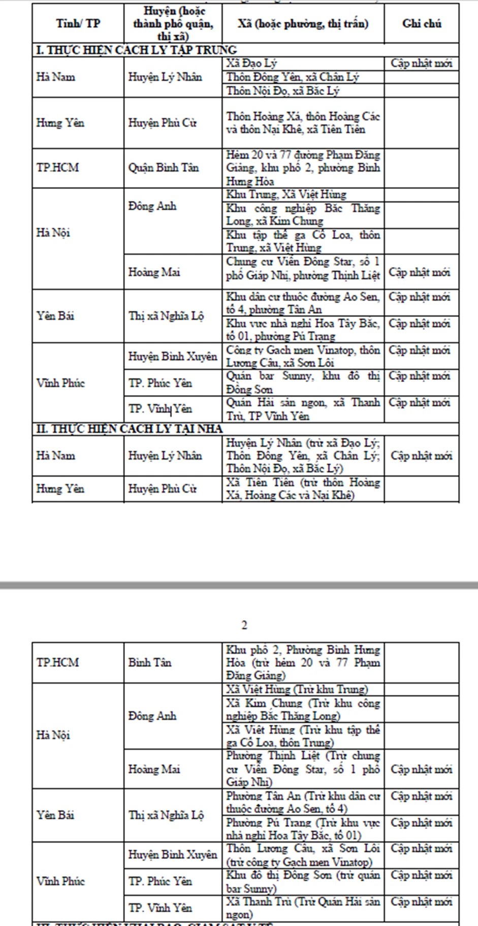 Bên cạnh đó, tiếp tục cập nhật danh sách các địa phương có liên quan đến dịch COVID-19 để áp dụng các biện pháp phòng, chống dịch bệnh đối với những người từ các vùng dịch này về (danh sách đính kèm) thì phải cách ly, thực hiện lấy mẫu xét nghiệm, khi có kết quả âm tính mới trở lại làm việc.