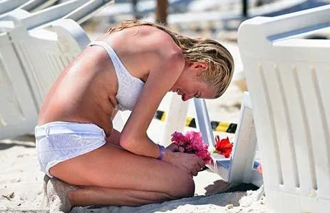 Du khách than khóc cho người cùng đi du lịch bị bắn chết trên bãi biển Sousse (Tunisia). Ảnh: GETTY IMAGES