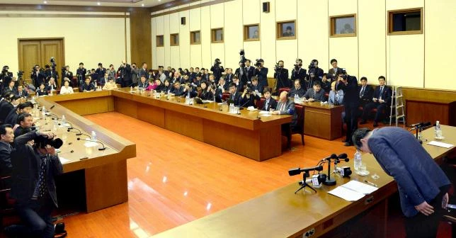 Ông Kim Dong Chul cúi gập người nhận tội và xin khoan hồng trong buổi họp báo ngày 25-3. Ảnh: REUTERS