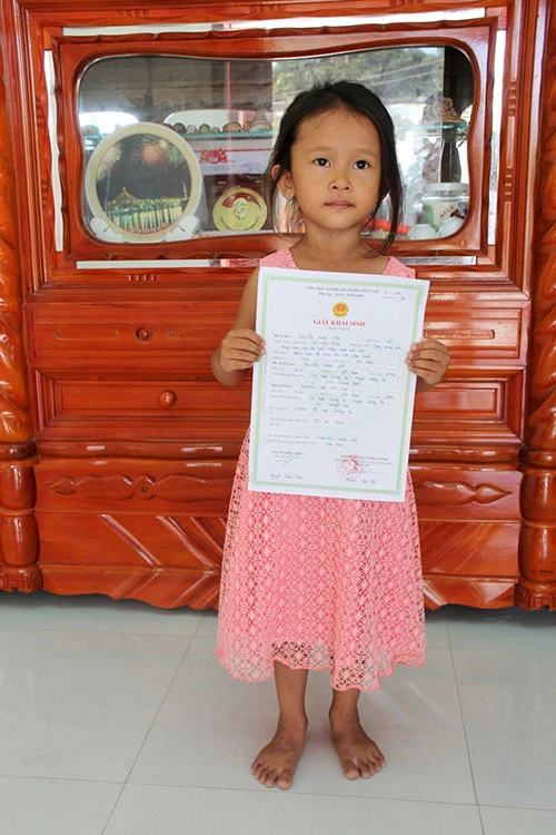 Bé Nguyễn Ngọc Hân, cầm giấy khai sinh tại thị trấn Trường Sa năm 2011