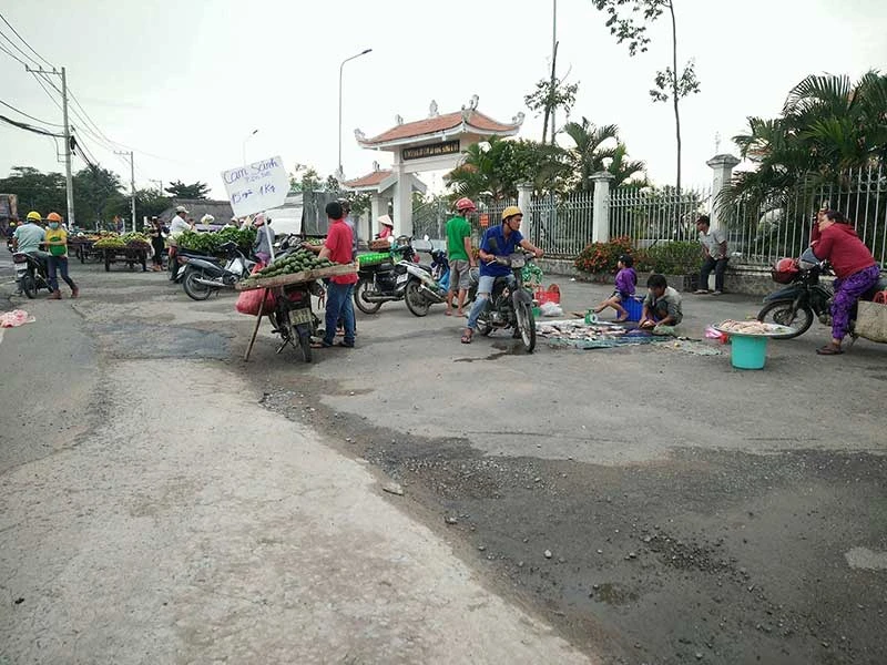 Chị TTP, một người sống gần đây, cho biết: “Hằng ngày khoảng 17 giờ tới 19 giờ, những hàng cá, thịt, rau bày ngay trên nền đất, còn có cả xe ba bánh, xe tải nhỏ chở trái cây ngang nhiên chiếm dụng phần mặt tiền cổng vào.
