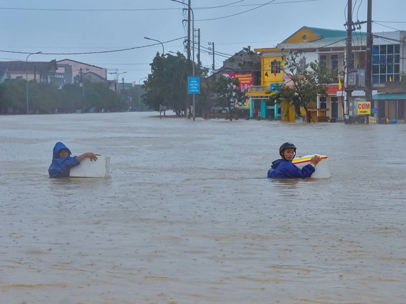 Vào tối 12-10, nước tại rốn lũ Quảng Điền, Thừa Thiên-Huế lên cao trở lại, quân đội dùng canô đưa mì tôm vào hỗ trợ người dân. Ảnh: NGUYỄN DO